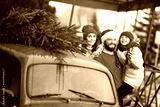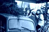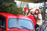 mom, dad in a Santa hat and a daughter in a knitted red hat with pigtails hug and smile against the background of a red car with a Christmas tree on the roof