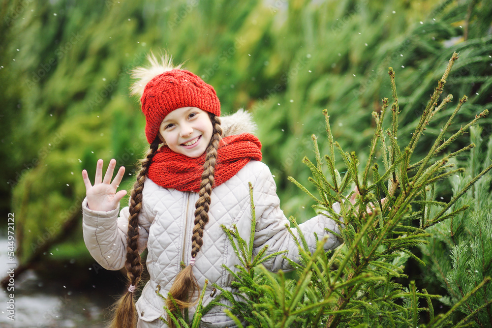 a little girl with pigtails in a red knitted hat and scarf smiles on the background of the Christmas tree market and chooses a Christmas tree