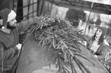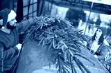 a married couple - a woman and a man in a Santa hat tie a Christmas tree to the roof of a red retro car. Preparing for Christmas.