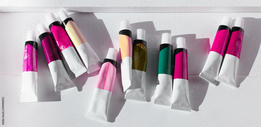 Acrylic pastel color paints in tubes on empty copy space white wood background. Flat lay, top view.