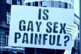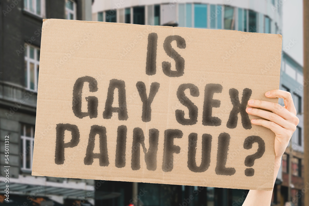 The question " Is gay sex painful? " is on a banner in men's hands with blurred background. Gay Sex. Sex. Sexual. Heterosexual. Sexuality. Problem. Hormone. Passion. Feeling. Guys. Man. Gay. Lgbt
