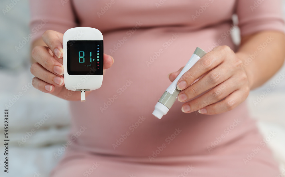pregnant woman holding glucose meter with result of measurement sugar level. gestational diabetes concept.