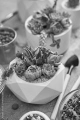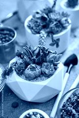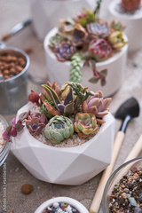 Group of Echeveria and Pachyveria opalina Succulent house plants in a pot on concrete table