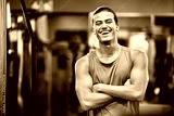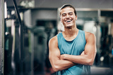 Fitness, gym and happy portrait of personal trainer man ready for workout coaching. Training, wellness and exercise coach confident with arms crossed at professional athlete health club.
