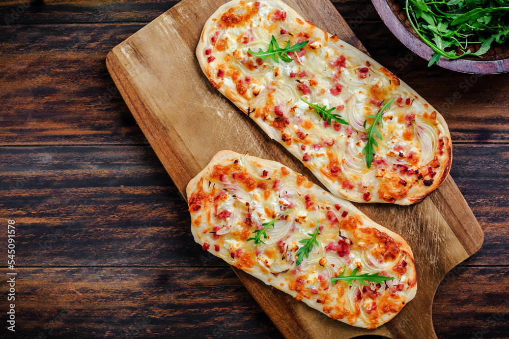French tarte flambee with cream cheese, bacon and onions. Flammkuchen from Alsace region