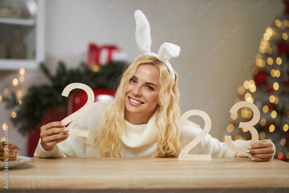 Front view of cheerful lady wearing rabbit ears, looking at camera, smiling, holding decoration. Attractive female wearing rabbit ears, posing at studio. Concept of new year.