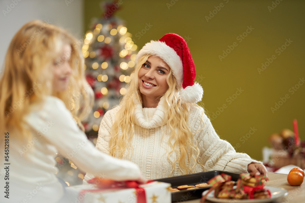 Front view of happy family posing indoors, having photoshoot at studio decorated with christmas tree. Blonde lady wearing christmas hat, looking at camera. Concept of holiday.