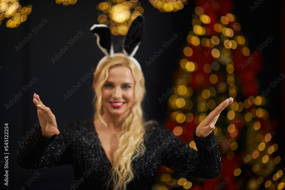 Front view of attractive woman with blonde, curly hair celebrating new year, dancing. Seductive young female with red lips looking at camera, smiling. Concept of winter holiday.