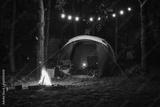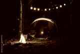 Atmospheric night adventure. Tent with a midnight fire in the forest.