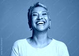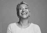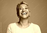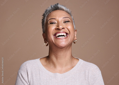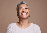 Black woman, beauty and happiness with a senior laughing about funny joke or memory on a brown studio background. Face portrait of a mature model posing for cosmetics, makeup or fashion mockup