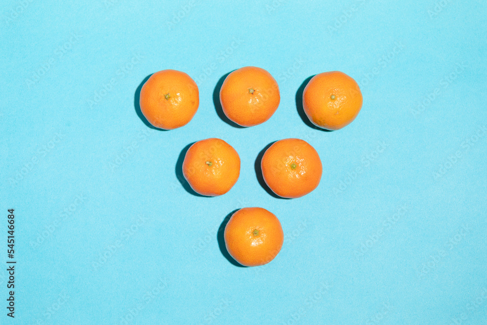 Juicy, natural and irregular tangerines on a blue background, with copy space, forming a triangle shape in a pop art style