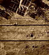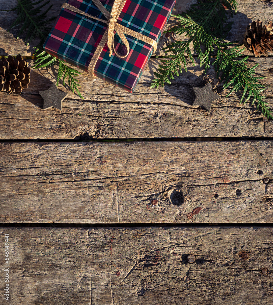 Christmas concept frame with tartan pattern gift box on the old weathered wooden table. Winter holiday vintage greeting card. Copy space