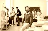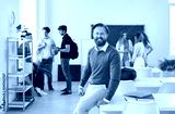 Portrait of a cheerful male teacher at work. Happy adult man smiling and looking at the camera while standing by a desk in the school classroom with students in the background