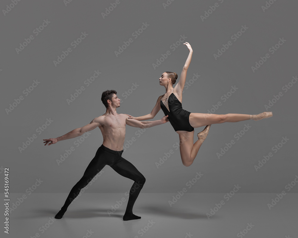 Young man and woman, ballet dancers performing isolated over dark grey studio background. Jumping high