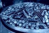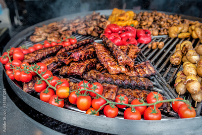 Healthy street food to go, potatoes, ribs, mushrooms, eggplants, meats, bell peppers, and cherry tomatoes. Delicious food cooked over an open fire