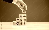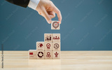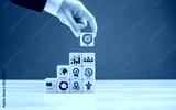 business strategy planning concept, action plan, goals and objectives, stack of wood on the table with icons showing business strategy ideas and action plans. business development concept copy space