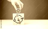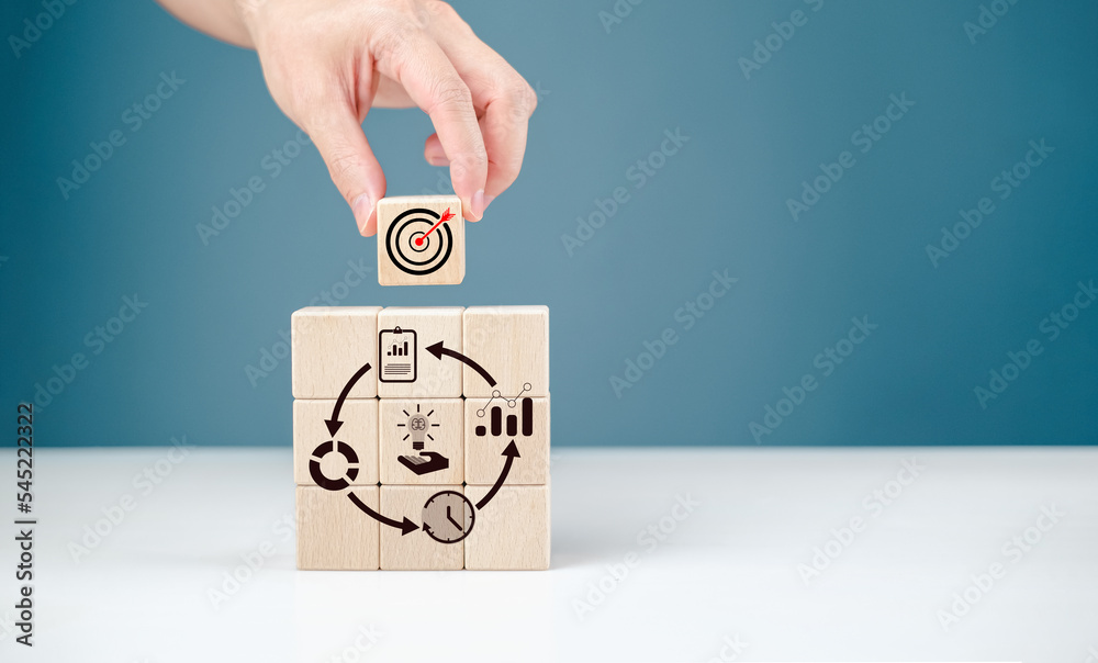 business strategy planning concept, action plan, goals and objectives, stack of wood on the table with icons showing business strategy ideas and action plans. business development concept copy space