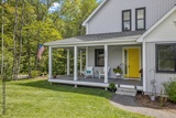 Beautiful gray porch of a modern custom new England colonial home with a garden