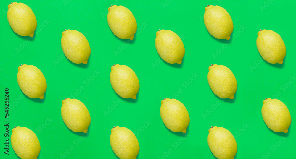 Lemon on the green background. Flat lay. Pattern. Top view.
