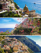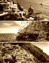 Collage. Panoramic view of the city and sea on the sunny day. Positano. Italy.