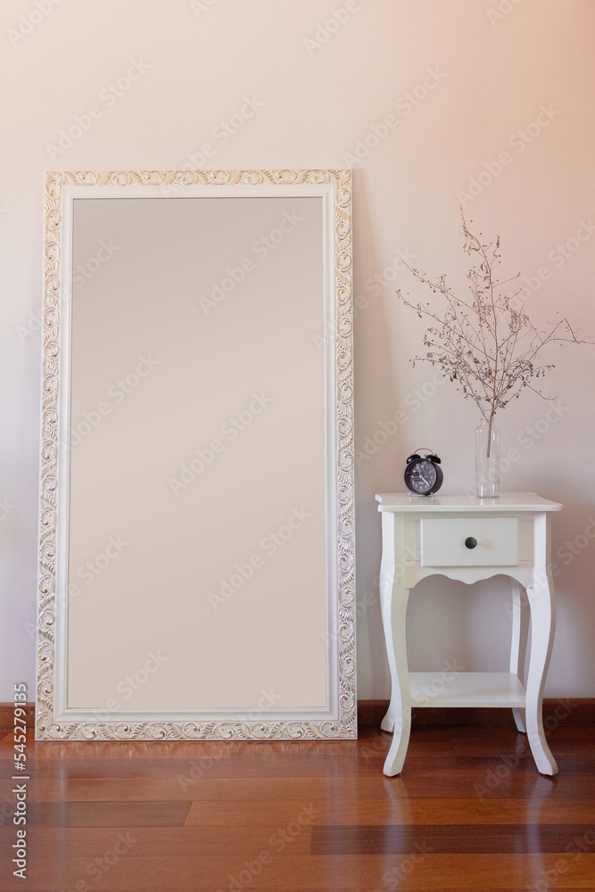 Stylish bedroom with mirror. Modern classic design. Comfortable home interior.