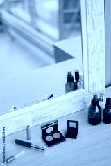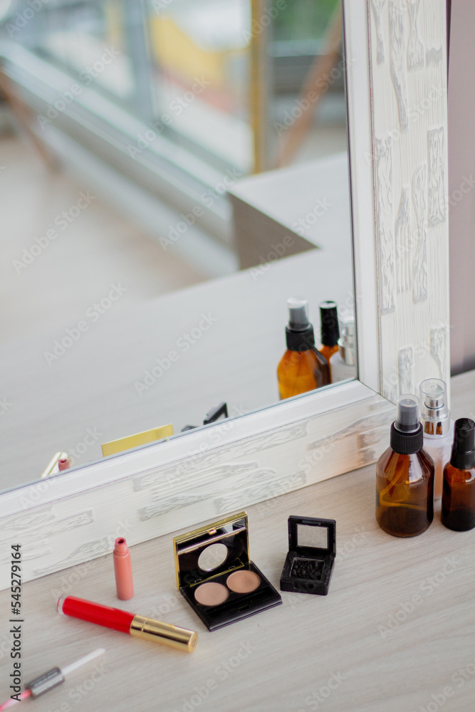 Mirror closeup. Makeup composition. Modern classic design. Comfortable home interior.