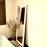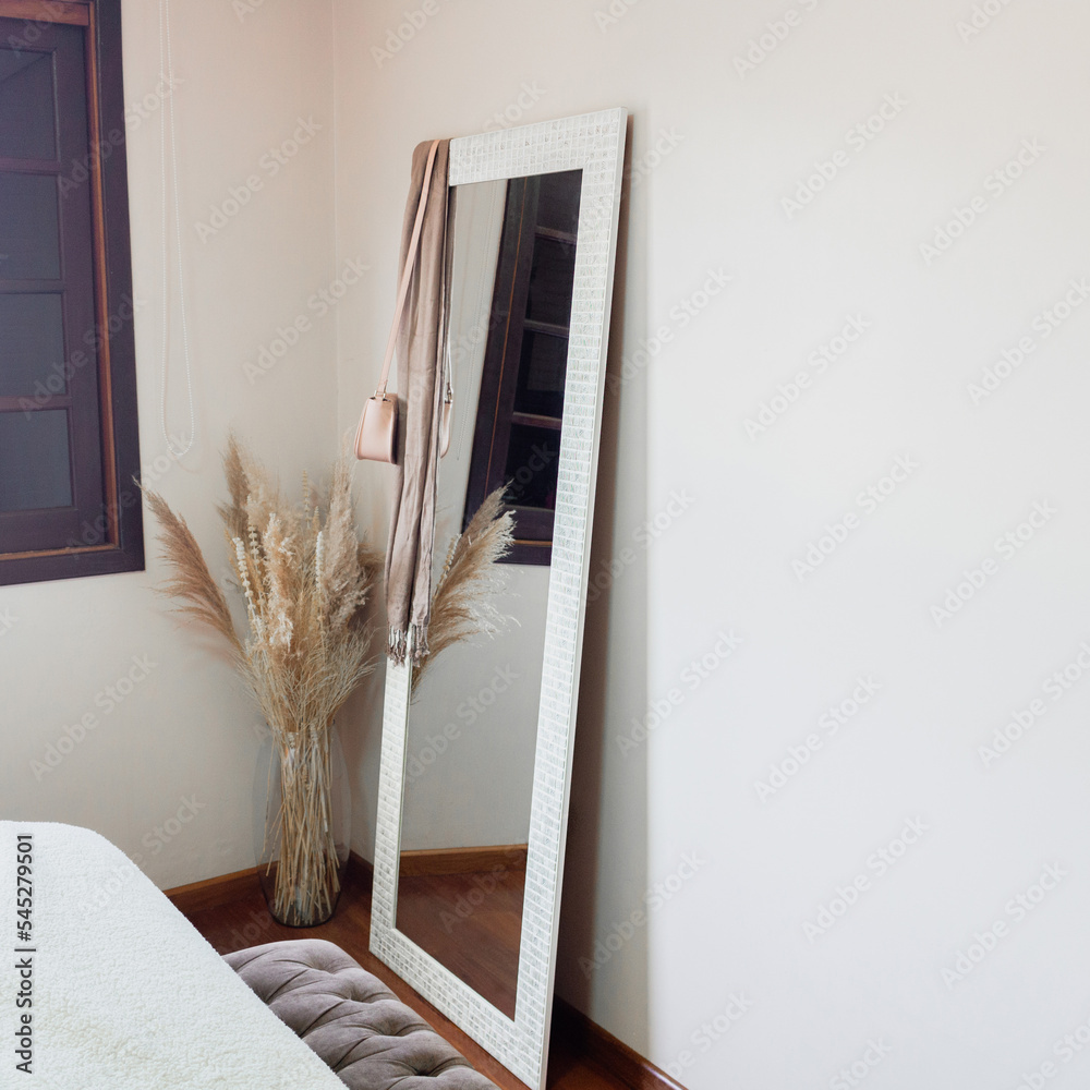 Stylish bedroom with mirror. Modern classic design. Comfortable home interior.