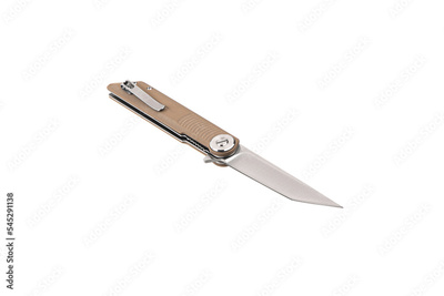 Pocket folding knife isolate on white back. Compact metal sharp knife with a folding blade.