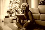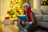 Girl reading next to a Christmas tree