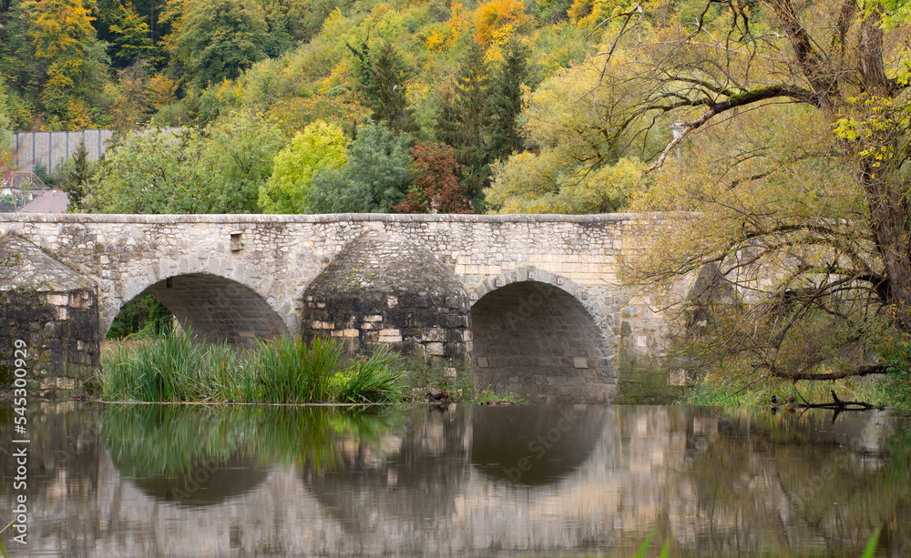 A historic stone bridge, with several round arches, is reflected in the water. In the background deciduous trees in autumn with golden leaves.