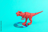 Toy red dinosaur tyrannosaurus rex with cd disk on a turquoise background. Minimalism creative layout