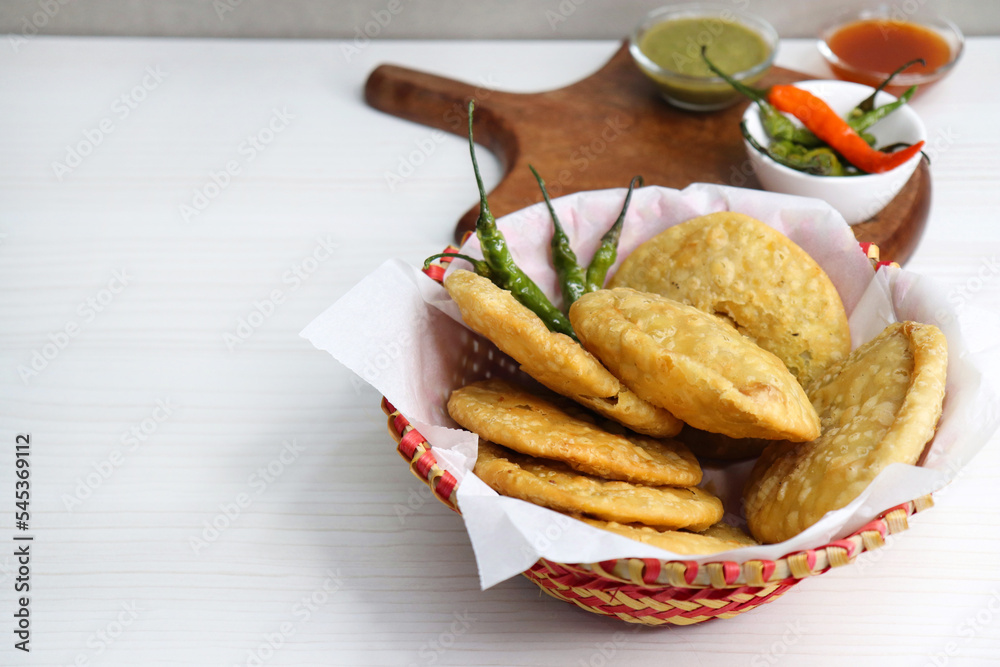 Shegaon Kachori or aloo pyaz ki kachodi served with green and red Chutney. Fried green chilies. it's a favorite Tea time snack, stuffed with lentils and spices mixture inside the dough. Deep fried.