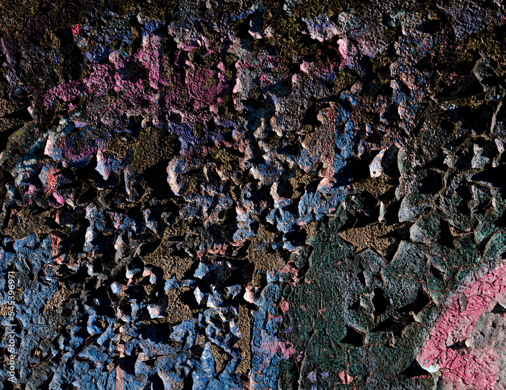 aged Graffiti wall, colorful background, Retro Vintage Worn Wall Wallpaper, Decayed Cracked Rough Abstract Banner Surface.