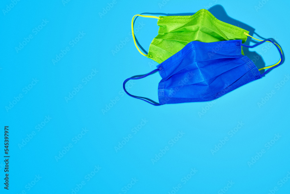 Minimalist medical still life of green and blue respiratory or surgical face mask on blue background. Bright and trendy coronavirus or dust protection supplies. Pandemic concept. Disposable mask.