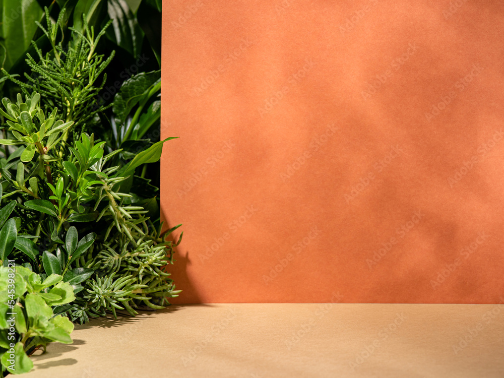 Minimalist botanical background with copy space. Neutral toned showcase for new product demonstration, promotion sale, packaging presentation, cosmetic or merchandise. Light and shadow. Front view.