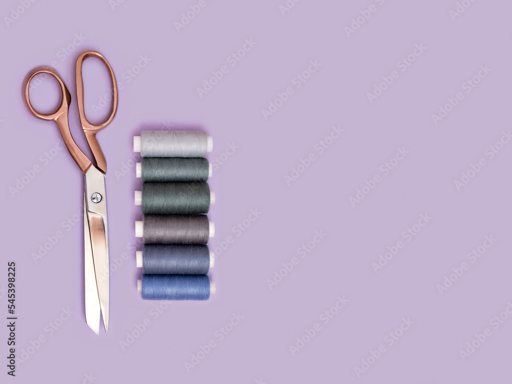 Minimalist scene of tailoring accessories. Flat lay with pink gold scissors and bobbins. Handmade, DIY, crafts, art or sewing concept. Clothes design and dressmaking. Copy space.