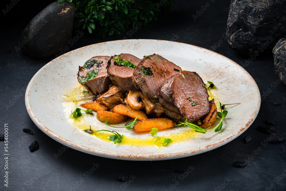 Beef medallions with mushroom sauce, sliced fried potato and microgreens.