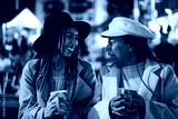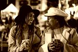 African mother and daughter having fun drinking hot chocolate outdoor in winter time - Focus on senior woman eye