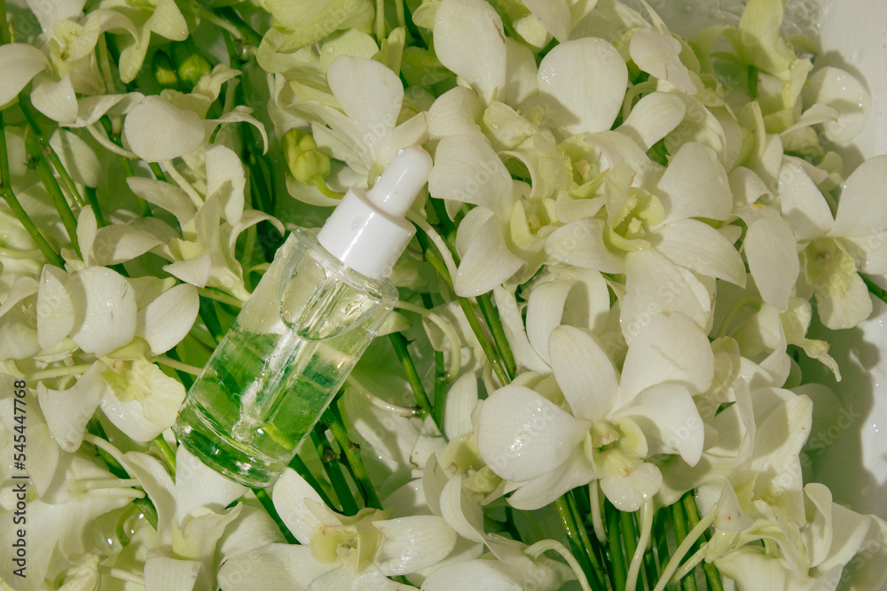 mockup tube bottle for skin care cosmetic with water splash and flower, product branding, serum dropper cream lotion treatment