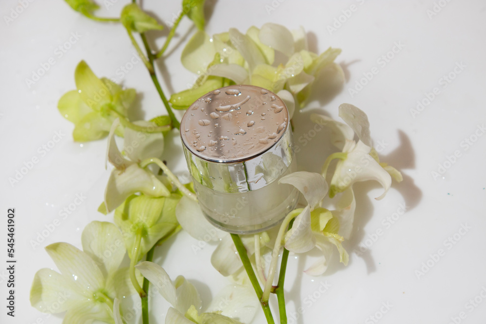 mockup tube bottle for skin care cosmetic with water splash and flower, product branding, serum dropper cream lotion treatment