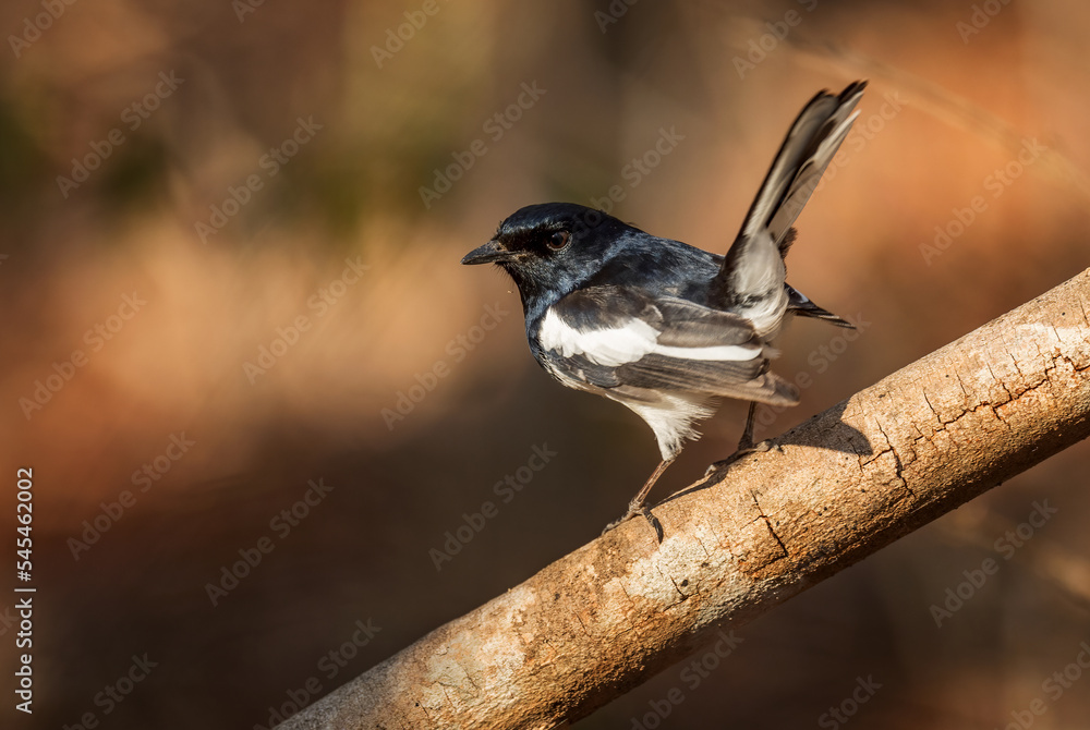 Madagascar Magpie-robin - Copsychus albospecularis, beautiful black and white bird endemic in Madagascar dry forests, Kirindy.