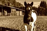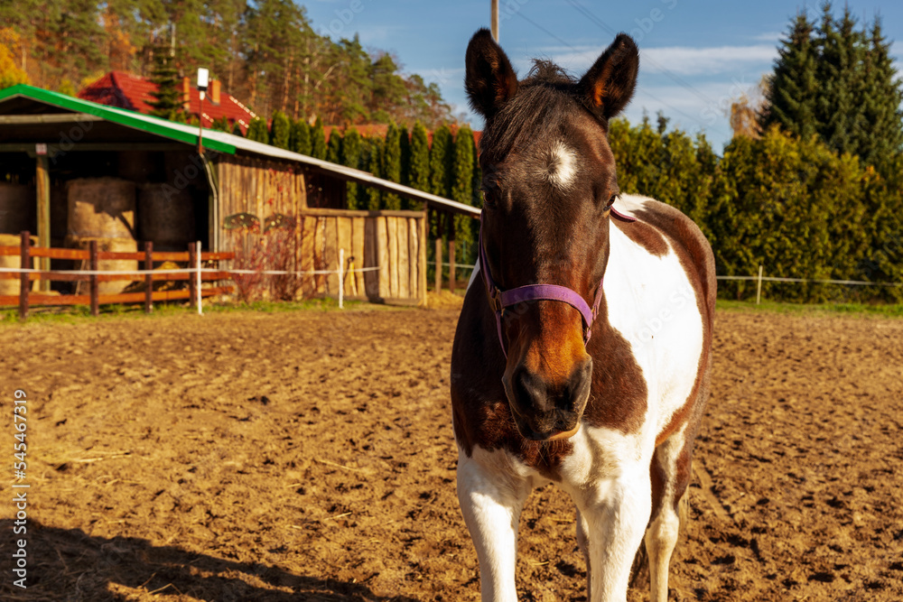 Łaciaty koń na padoku w piękny słoneczny dzień.