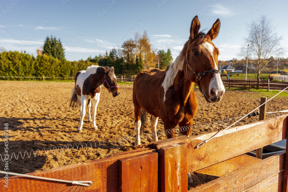 Łaciaty koń na padoku w piękny słoneczny dzień.