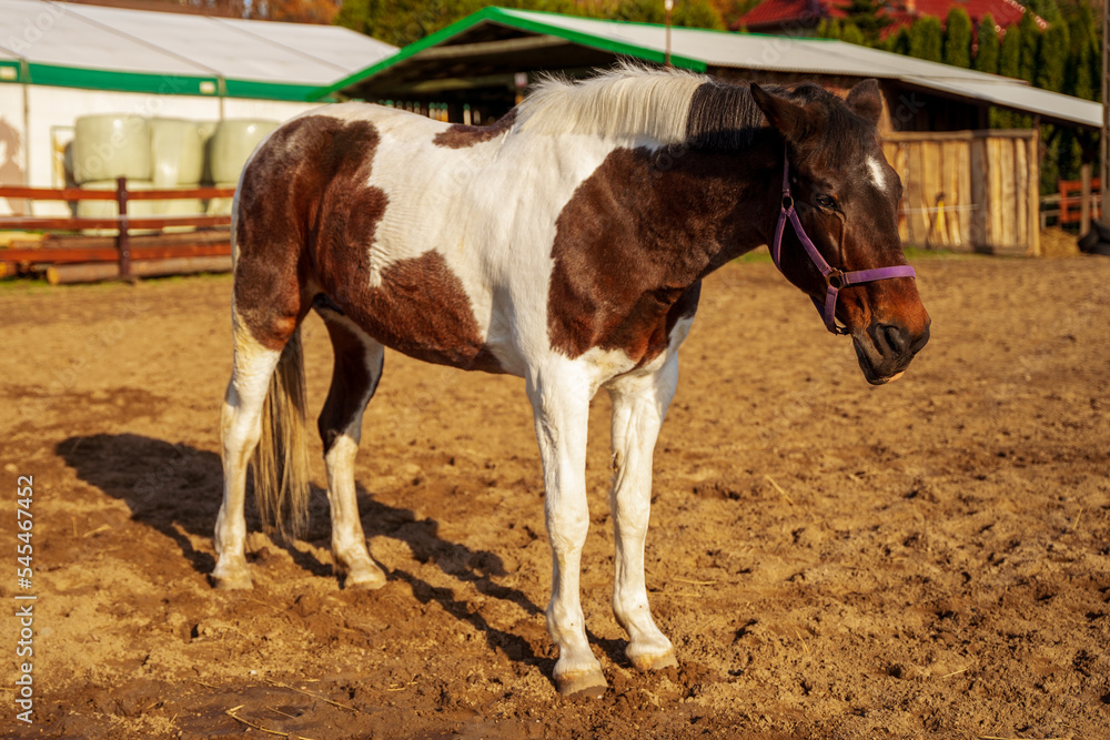Łaciaty koń na padoku w piękny słoneczny dzień.