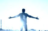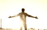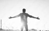 Young man with hands up the morning sun light finding happiness, peace and hope in nature