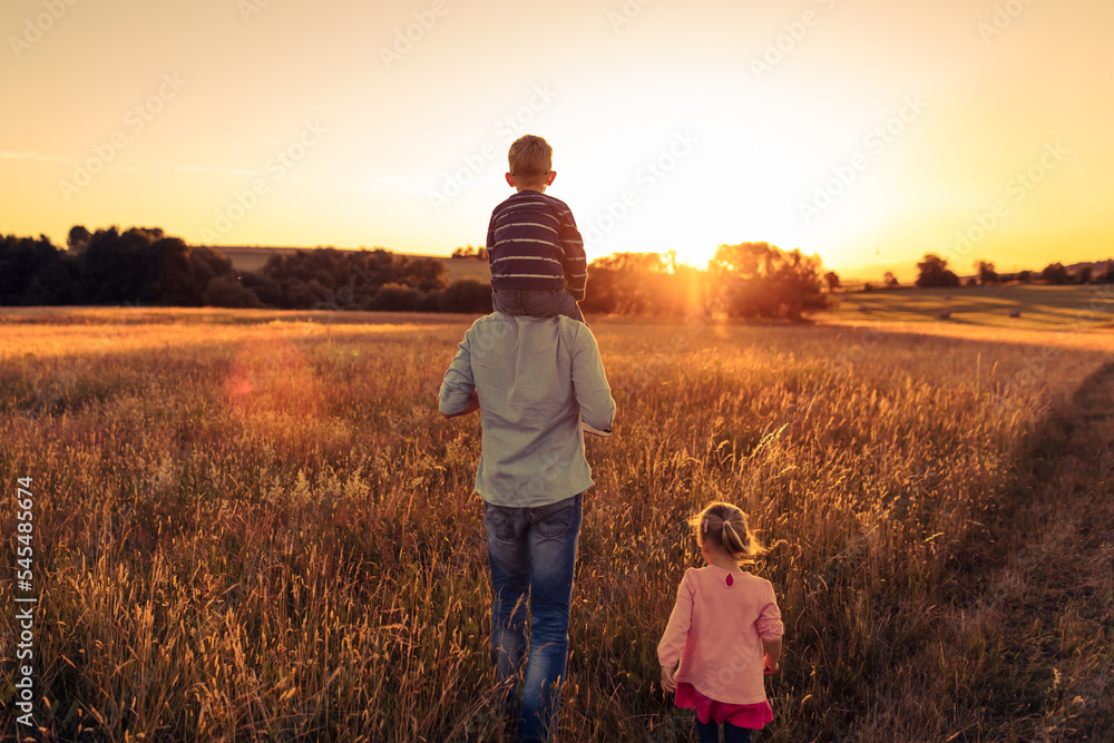 Father walking in nature meadow with his children. Fatherhood, and family parenting lifestyle concept.