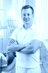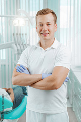 Doctor dentist smiling and standing with hands crossed in dental clinic on backdrop with medical equipment, x-ray dental and patient. Smile healthy teeth concept