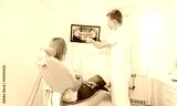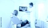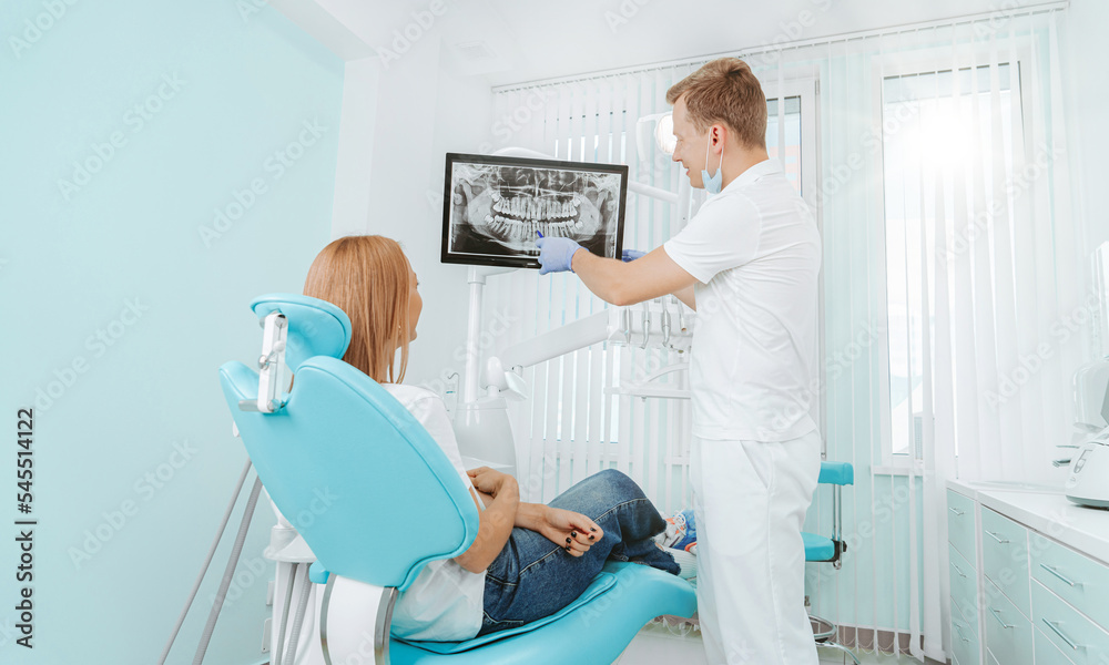 Doctor dentist and woman patient watching x-ray on digital screen in stomatology clinic with medical equipment. Smile healthy teeth concept