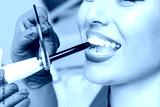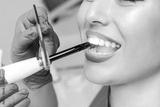 Doctor dentist whiten teeth to young attractive patient woman in stomotology clinic. Hands doctor dentist with medical tools. Healthy teeth concept