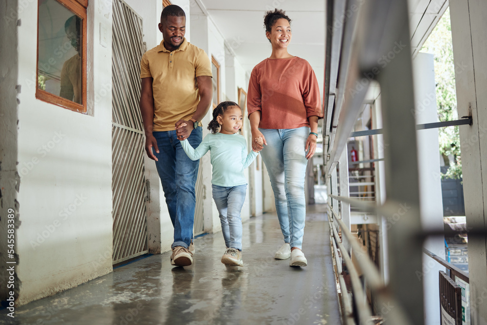 Black family, parents or girl bonding in animal shelter, community volunteer charity or homeless pets center. Smile, happy child or holding hands and walking mother, father or rescue adoption kennel